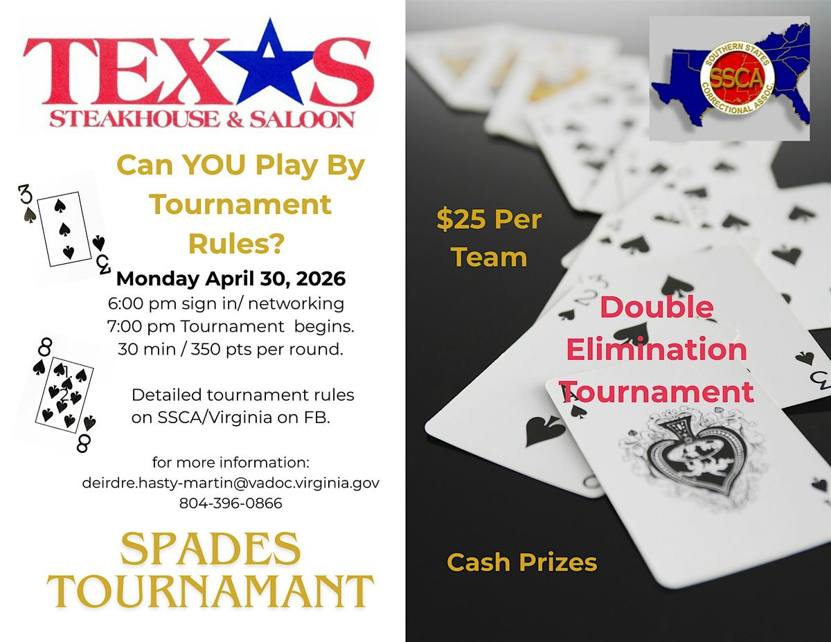 We’re bringing the corrections community together for an exciting evening of cards, competition, and great food at Texas Steakhouse & Saloon in Princeton, WV. Whether you're a seasoned Spades player or just enjoy a good time with friends, this event is for you.