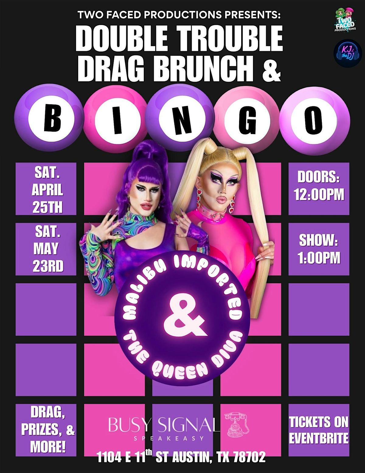 Two Faced Productions presents Double Trouble, a brand new brunch experience featuring drag performances, bingo, prizes, and more — all inside a hidden speakeasy at Busy Signal Speakeasy. Make a call and enter through the phone booth and step into a brunch show that’s a little more interactive, a little more chaotic, and a lot more fun than your typical brunch. This experience includes a full drag brunch show, bingo rounds throughout the event with free prizes, and photo opportunities with the queens after the show. Whether you’re celebrating an occasion , planning a girls or gays weekend, visiting Austin, or just want a different kind of brunch, Double Trouble is the perfect way to spend your Saturday!