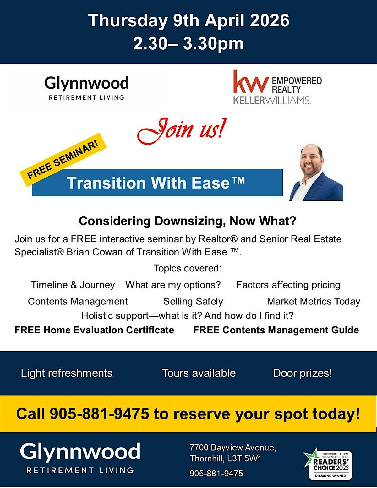 🆓 Join us for a FREE Seminar April 9th at 2:30 at Glynnwood Retirement Residence with Brian Cowan, Realtor® of Transition with Ease at Keller Williams Empowered Realty