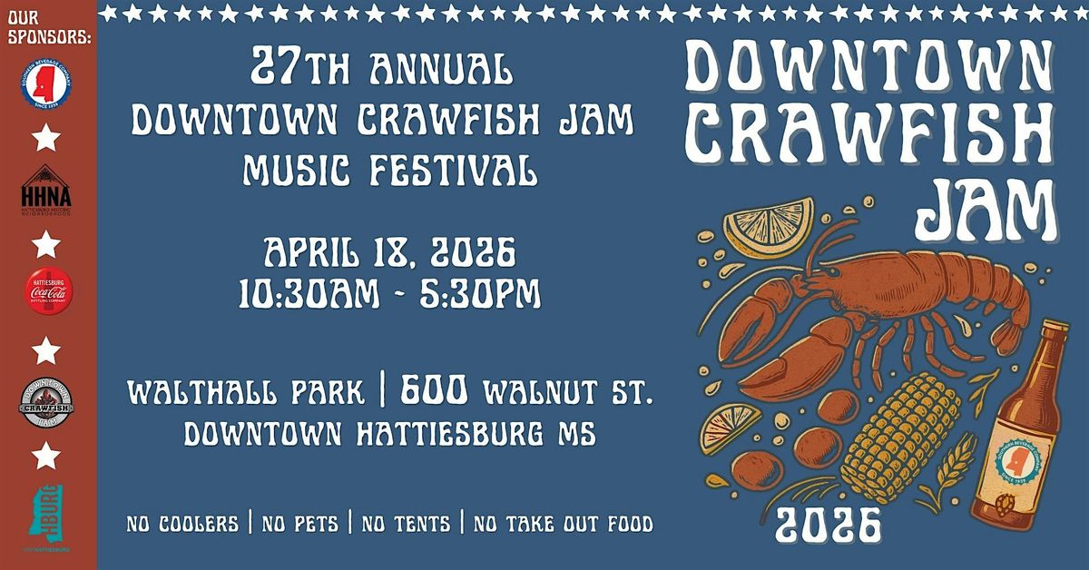 The 26th Annual Downtown Crawfish Jam Music Festival (DCJ) presented in part by Southern Beverage, is set for April 18, 2026 at Walthall Park. DCJ is one of several fun neighborhood events hosted by the Hattiesburg Historic Neighborhood throughout the year and serves as their largest fundraiser for the Walthall Foundation.