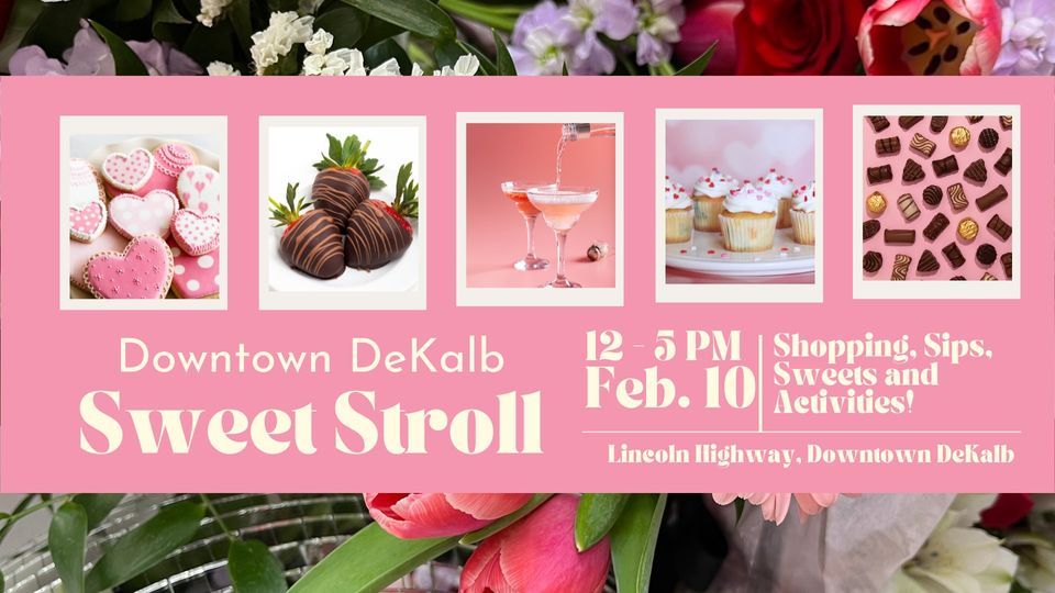 Join us for the second annual Downtown DeKalb Sweet Stroll along Lincoln Highway! Pick up your Sweet Stroll Passport at any host business and get your passport stamped at every participating stop along the way. Turn in your passport at your last stop and you will be entered to win one of several Valentine’s Day prizes including a year of flowers from Willrett Flower Company and gift cards from your favorite downtown businesses! Several downtown shops will host a variety of specialty sweets vendors in their stores. Everything from cheesecake to chocolate covered strawberries! Visit the Kid’s Area at Amy's Schoolhouse, LLC (122 N 1st St # C, DeKalb, IL 60115) for Sweet Butts Cotton Candy, Tote Bag Decorating with Evsie, face painting and more!