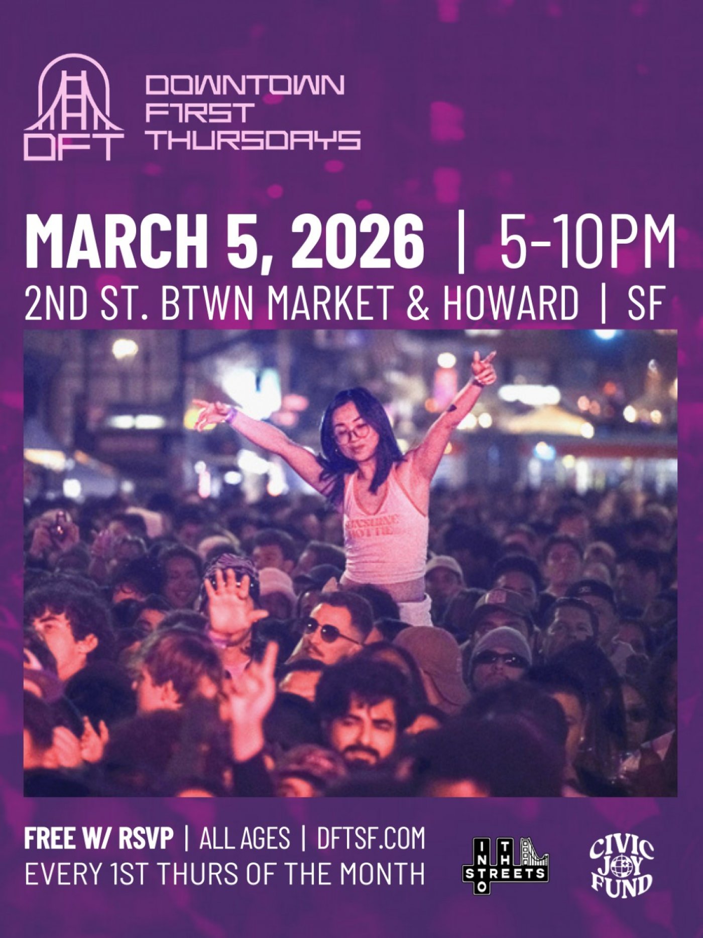 DFT is presented by Into The Streets and Civic Joy Fund in partnership The East Cut CBD, Yerba Buena Partnership, Natoma Cabana, and 111 Minna Gallery.