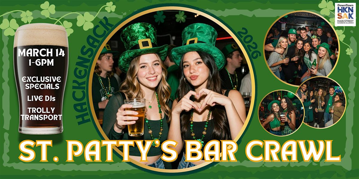 Hackensack is going green! Join us for the biggest St. Patrick's Day Bar Crawl in Bergen County . We're crawling through the best bars and restaurants downtown Hackensack has to offer. Grab your crew, wear your green, and get ready for a day you won't forget.