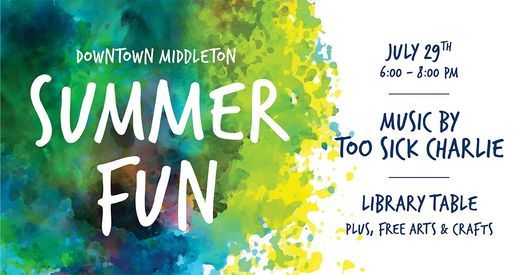 The Middleton Arts Committee is sponsoring a free arts and crafts table for children. The Library will bring an outreach table and hula hoops. There will also be street chalk available to use.