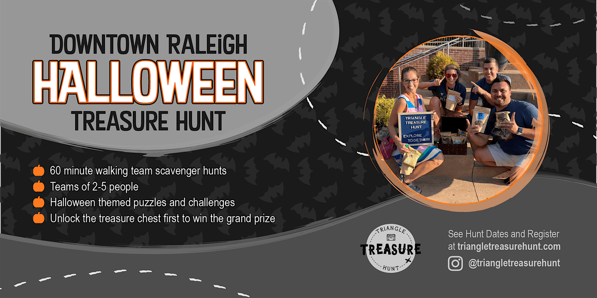 Treasure Hunters will meet at Sir Walter Coffee + Kitchen (555 Fayetteville St. Suite 110, Raleigh, NC 27601) and then depart with their treasure map on a walking team scavenger hunt where they will use their minds and feet to follow clues, solve puzzles, and crack codes to find and unlock the treasure chest for a grand prize! This special treasure hunt will feature Halloween-themed clues, puzzles, and prizes!