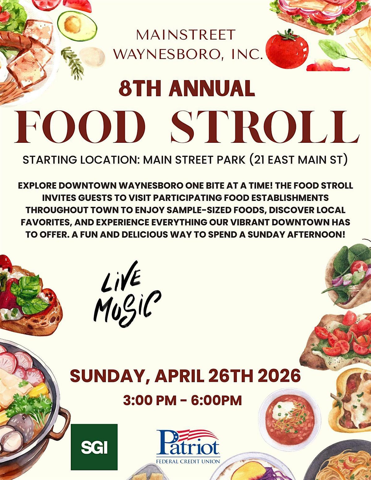 Explore downtown Waynesboro one bite at a time! The Food Stroll invites guests to visit participating Food Establishments throughout town to enjoy sample-sized foods, discover local favorites, and experience everything ourvibrant downtown has to offer. A fun and delicious way to spend a Sunday afternoon!
