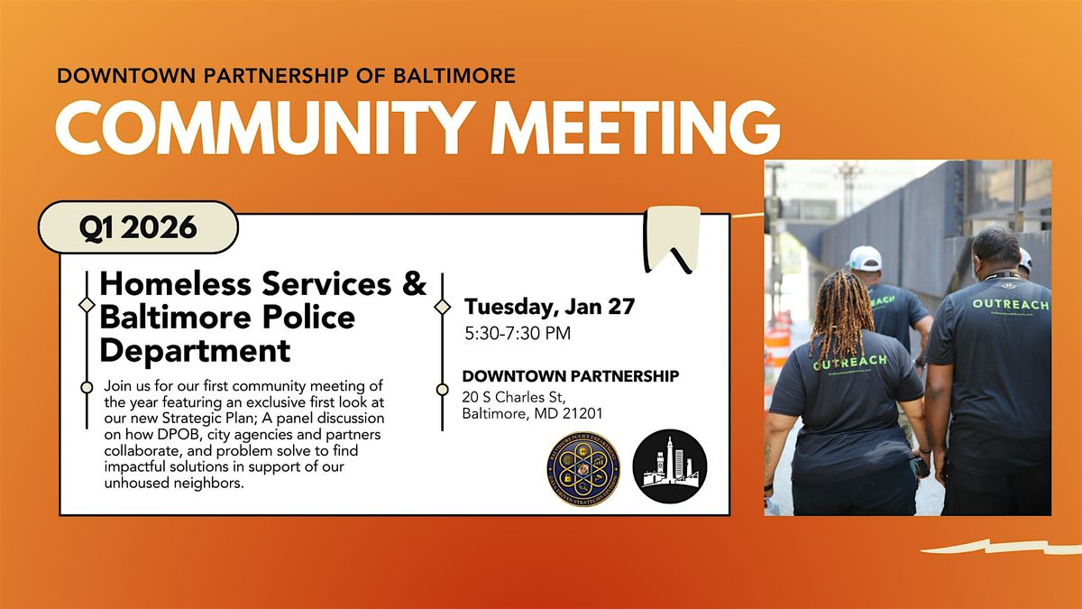 Join Downtown Partnership of Baltimore (DPOB) for its first community meeting of the year featuring an exclusive first look at our new Strategic Plan FY26 – 31, which redefines our vision, mission, and values to better serve Downtown Baltimore. A panel discussion will also take place on how DPOB, city agencies and partners collaborate, and problem solve to find impactful solutions in support of our unhoused neighbors.
