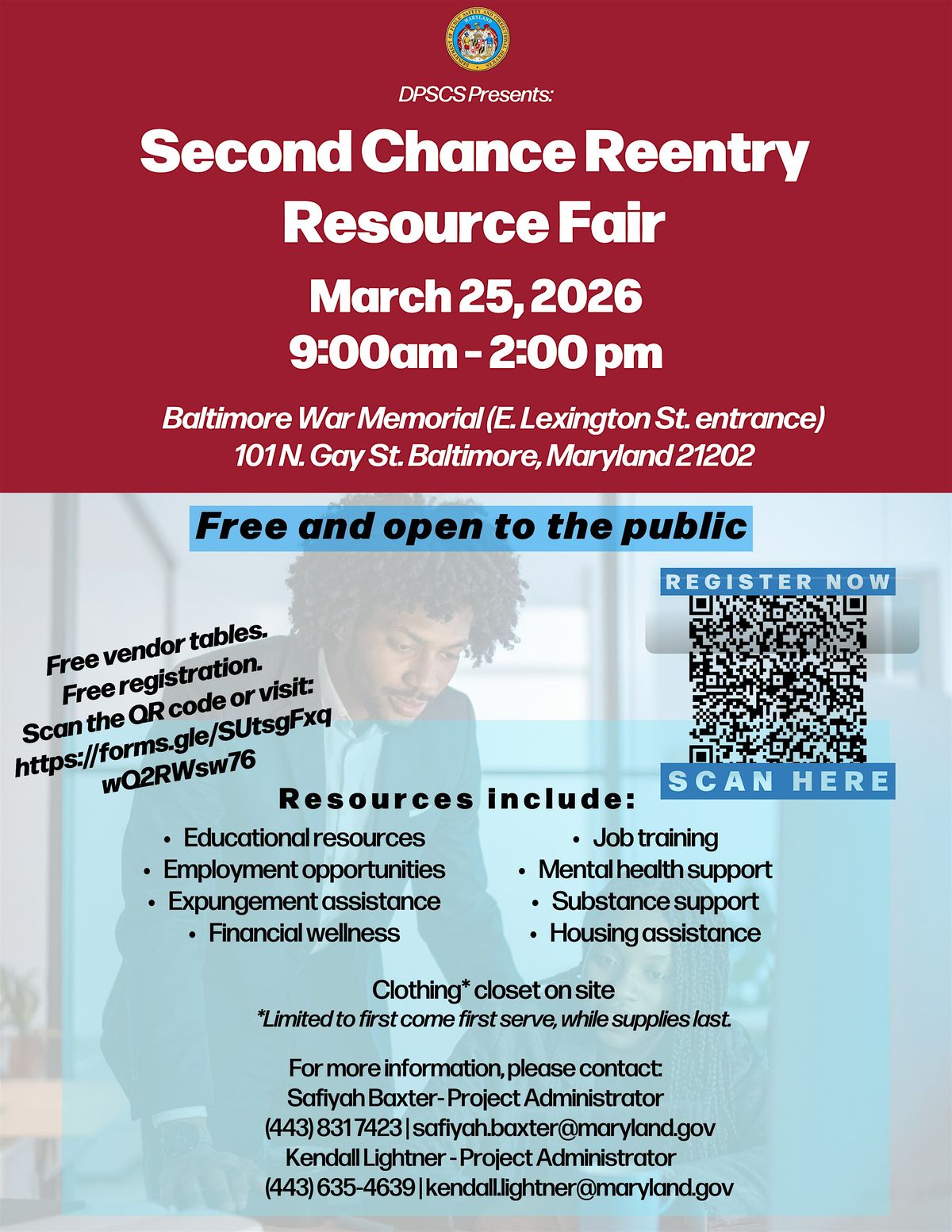 In celebration of National Second Chance Month this April, we are delighted to invite you to the Second Chance Reentry Resource Fair on Wednesday March 25, 2026, hosted by the Maryland Department of Public Safety and Correctional Services (DPSCS).