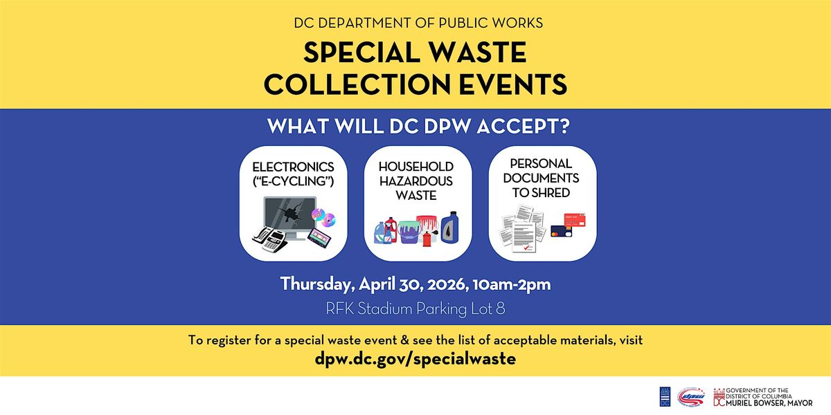 DC DPW’s Special Waste Collection Event, scheduled for Thursday, April 30, 2026, will be held at RFK Stadium's Parking Lot 8.