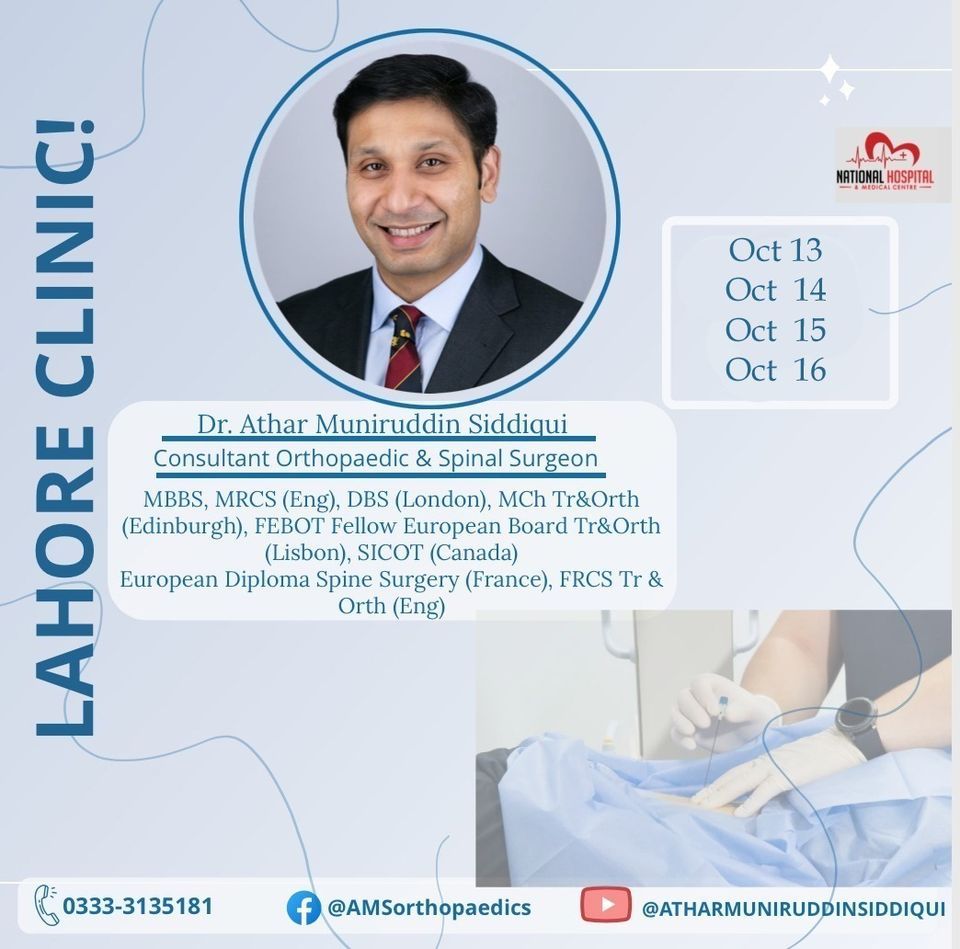 Dr Athar M Siddiqui's upcoming Lahore Clinic at National Hospital DHA Lahore starting from OCT 13th