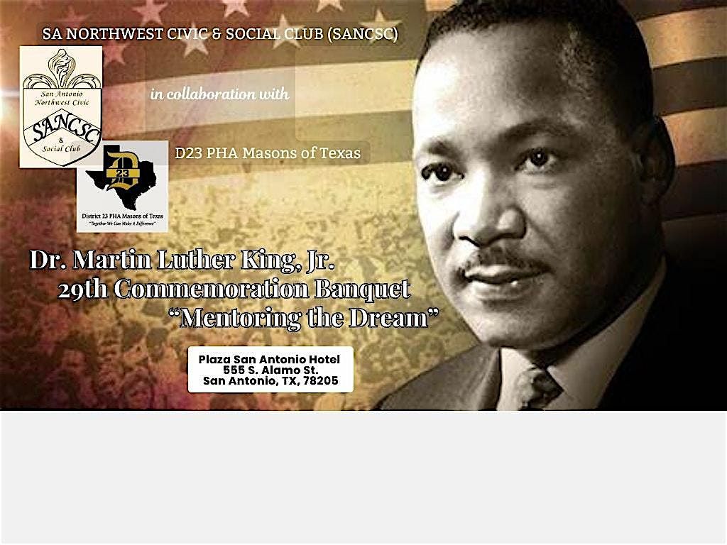 San Antonio Northwest Civic and Social Club (SANCSC), in partnership with D23 PHA Masons of Texas, will present its 29th Annual Commemorative Banquet to honor the legacy of Dr. Martin Luther King, Jr. This distinguished event is expected to welcome approximately 250 to 300 attendees representing a broad spectrum of businesses and community organizations. Guests will have the privilege of hearing an esteemed keynote speaker whose remarks will encourage ongoing efforts toward meaningful change. The evening will include additional entertainment and a carefully curated plated dinner, providing an excellent setting for networking and engagement among individuals dedicated to advancing Dr. King’s vision. The theme for this year’s celebration and memorial observance is “Mentoring the Dream.” We cordially invite you to join us for an inspirational night of tribute and fellowship.