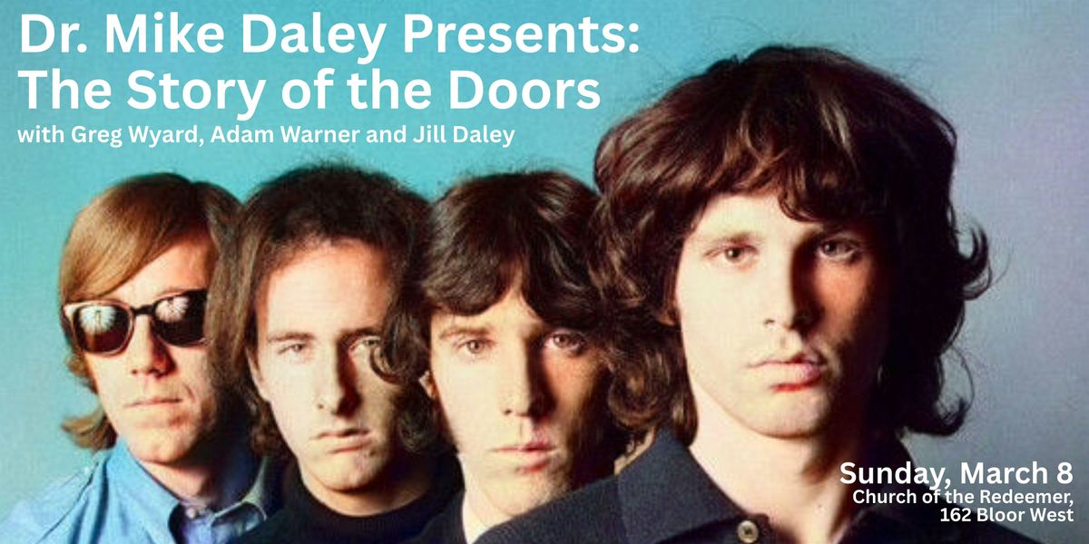 With hits like "Light My Fire," "Riders On The Storm" and "Break On Through," the Doors are one of the most beloved rock groups of all time. Dr. Mike Daley Presents: The Story of the Doors is an entertaining lecture-concert celebrating their career and music, featuring Mike on guitar and vocals, Greg Wyard on bass and vocals, Adam Warner on drums and vocals, and Jill Daley on piano and organ.