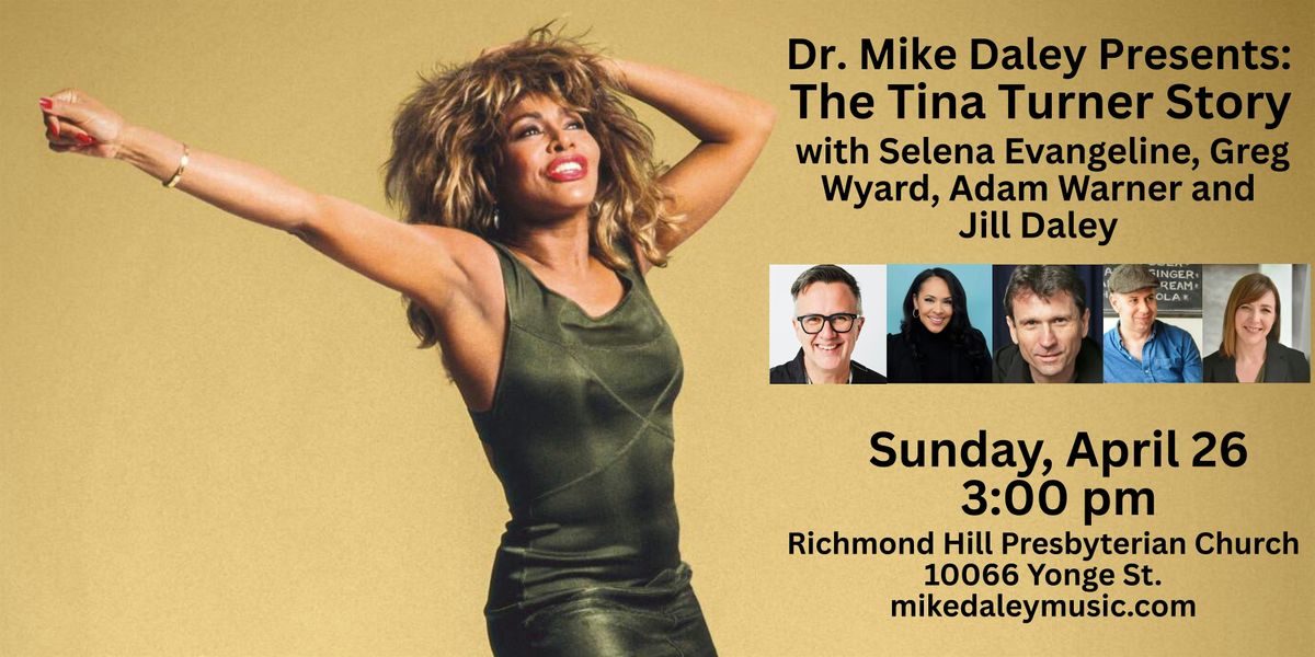 Dr. Mike Daley Presents: The Tina Turner Story is a lecture-concert combining renditions of Tina's classic hit songs with Dr. Mike's fascinating story of her life and career. Along with Mike's narration, guitar and vocals, Selena Evangeline sings lead, Jill Daley contributes piano and violin, Greg Wyard sings and plays bass, and Adam Warner joins in on percussion.