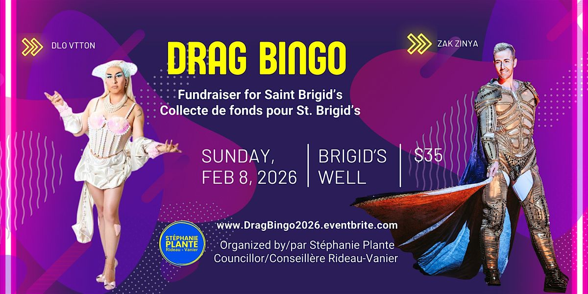 Joignez-vous à Stéphanie Plante, conseillère du quartier 12, et à d'autres invités spéciaux pour un après-midi amusant de Bingo Drag avec les artistes Drag d'Ottawa Zak Zinya (@zakzinya) et DLo Vtton (@dlovtton). Tous les profits de l'événement soutiendront Capital Feis et le Centre des arts de St. Brigid.