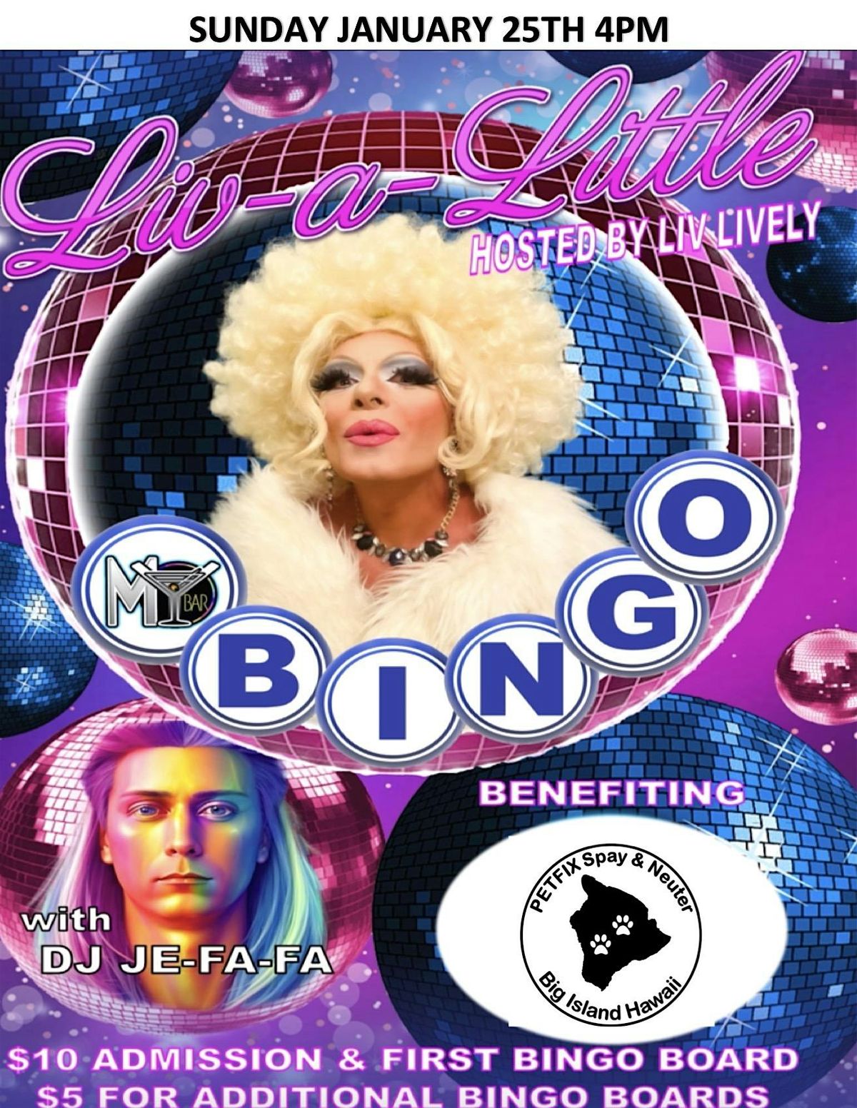 SUNDAY FUNDAY DRAG BINGO - Come join your hostess Ms.Liv Lively raise some funds for PETFIX while having the best Sunday Funday here at My Bar Kona! DOORS @ 3PM and Bingo starts at 4pm sharp. One Bingo card provided upon checkin and addition cards are available with a donation to our local non-profit of the month at the event!