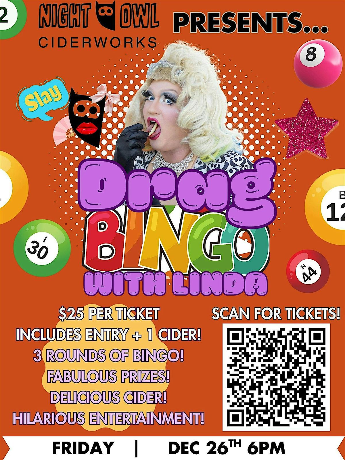 This isn't your grandma's bingo (unless you had a really fabulous grandma)! Join us at Night Owl Ciderworks, Ventura on January 23rd, doors at 6pm and Bingo starting at 6:30pm, for our DRAG BINGO hosted by Linda. Sip on a cool glass of cider and play for a chance at some wonderful prizes! Linda will keep you entertained all night with her remarkable wit and incredible performances. So, why not start the weekend a little earlier with some cider and drag bingo! Tickets are $25 and include admission and your first cider!