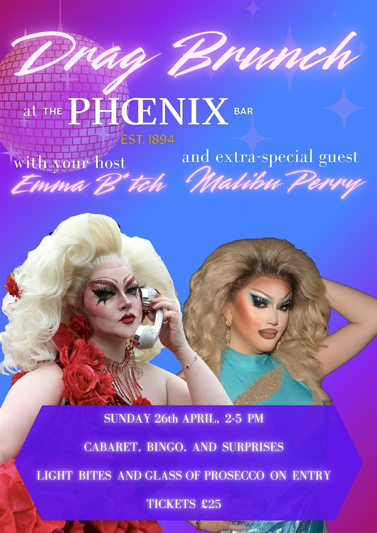 The Phoenix are excited to welcome you to Drag Brunch from 2-5 PM on April 26! A glass of prosecco or mimosa will be provided on entry, and an assortment of light bites will be available throughout the show. Our drag hosts will bring the glamour and the fun as we dance and party our way through a fabulous few hours! Expect great music, hilarious banter, exciting games, and surprises throughout your new favourite Sunday afternoon.