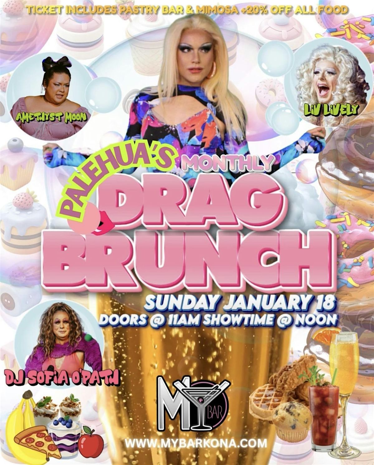 Your FAVORITE time of the MONTH DRAG BRUNCH @MYBAR -Enjoy a complimentary pastries bar and a Mimosa included with your ticket! You will also receive 20% off of our new BRUNCH menu. Palehua and her rotating cast of her fave gal pals are sure to gie you the SUNDAY FUNDAY to count on monthly!