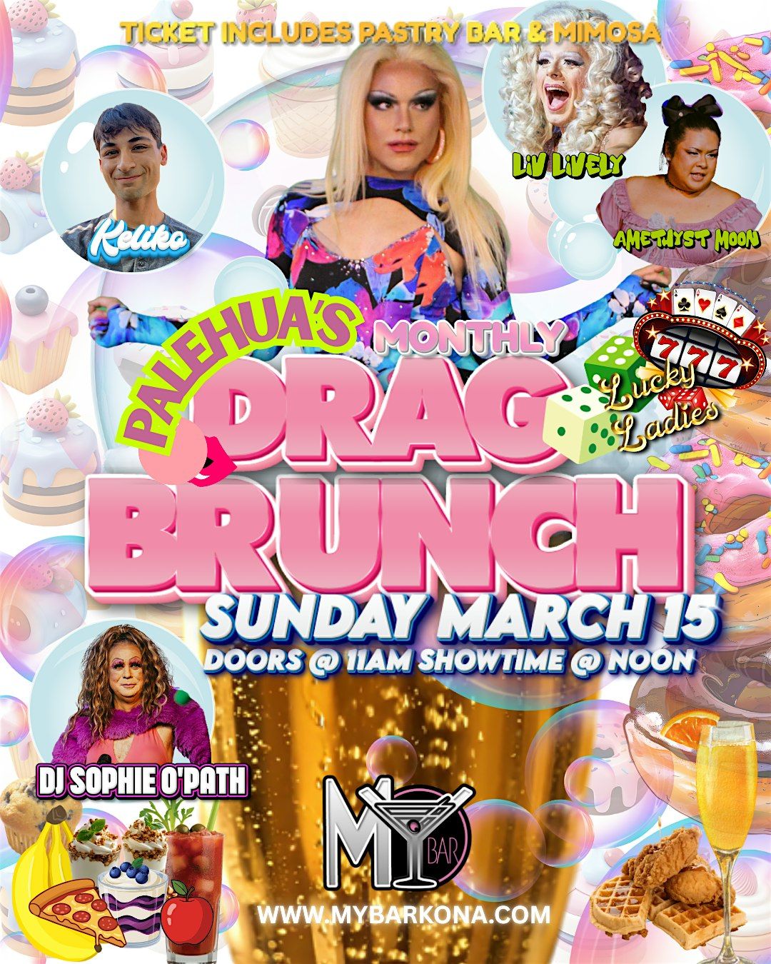 Your FAVORITE time of the MONTH DRAG BRUNCH @MYBAR -Enjoy a complimentary pastries bar and a Mimosa or Bloody Mary included with your ticket! Palehua and her rotating cast of her fave gal pals are sure to give you the SUNDAY FUNDAY to count on monthly!