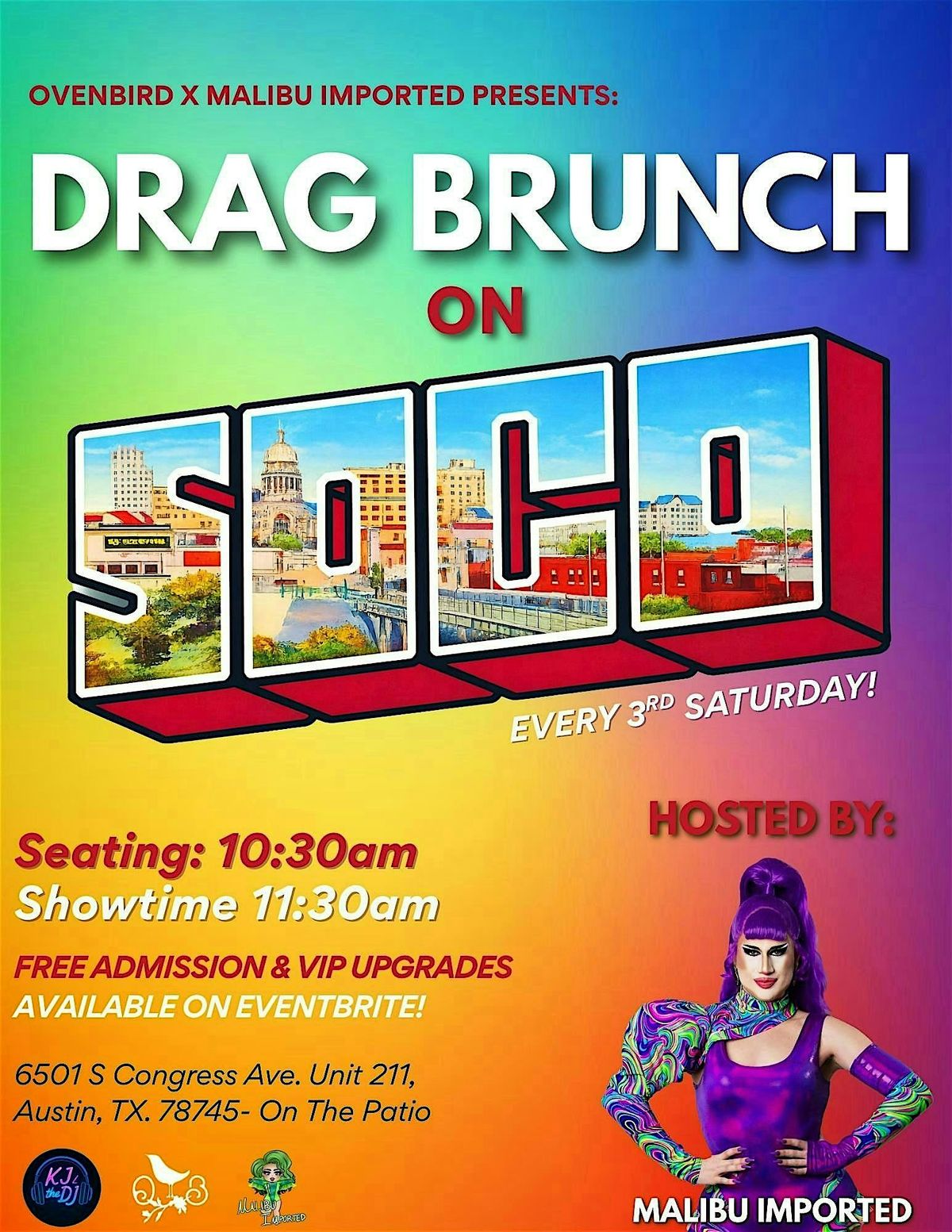 Brunch just got fabulous on South Congress! Join us at Ovenbird for Drag Brunch on SOCO, a high-energy patio party featuring fierce drag performances, delicious brunch bites, and flowing drink specials—right in the heart of one of Austin’s most iconic districts. Hosted by Malibu Imported, with a live DJ keeping the vibes high all brunch long.
