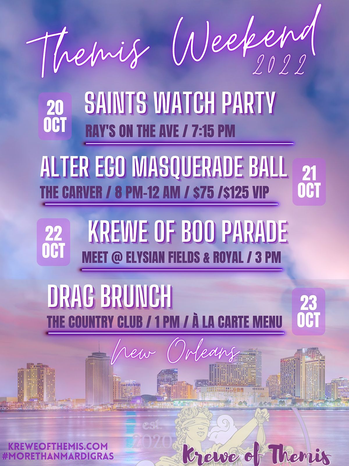 Join the Krewe of Themis as we close out our inaugural Themis Weekend experience! Enjoy a selection of delicious a la carte' menu items as you indulge in a variety of cocktails, while we bask in the glory of the illustrious Drag Queens who will perform for us. The Country Club has one of the most sought after Drag Queen Brunches in the city of New Orleans, so rest assured this brunch will not disappoint. We look forward to seeing you there!