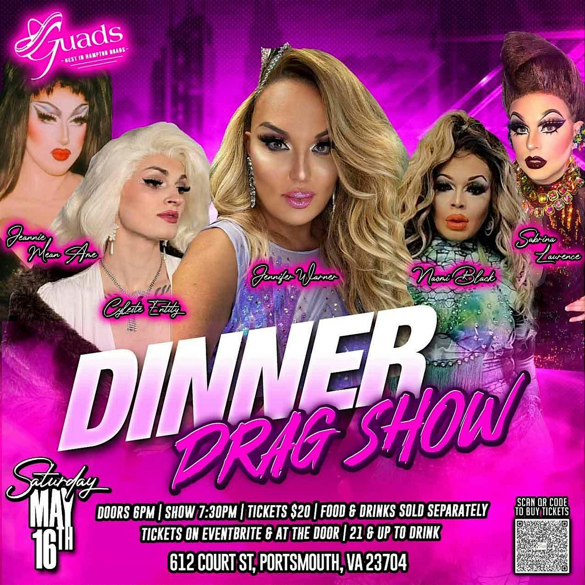 Drag Dinner Show Saturday May 16th at Guads Oldetowne doors open 6pm show starts at 7:30pm jennifer Warner & the Dolls