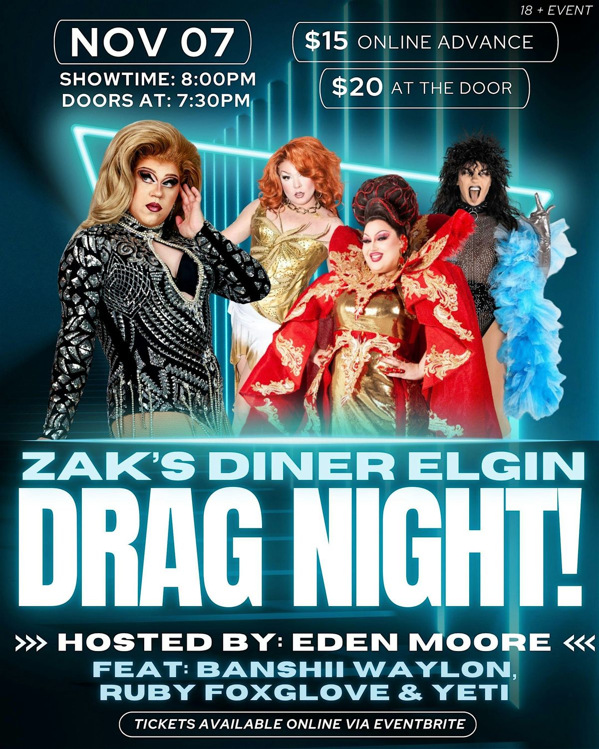 Drag Night! is officially back at Zak's Diner Elgin! Get ready for a fabulous evening filled with dazzling drag performances and delectable diner dishes.