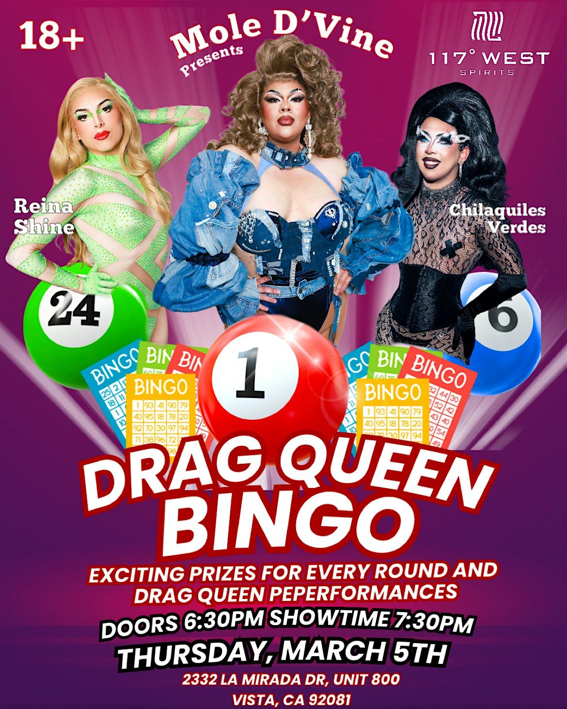 Join us on Thursday, March 5th for Drag Queen Bingo Hosted by Molé D'Vine! with Special Guest performances by Reina Shine and Chilaquiles Verdes. Enjoy a few round of bingo and 117 Signiture Cocktails.