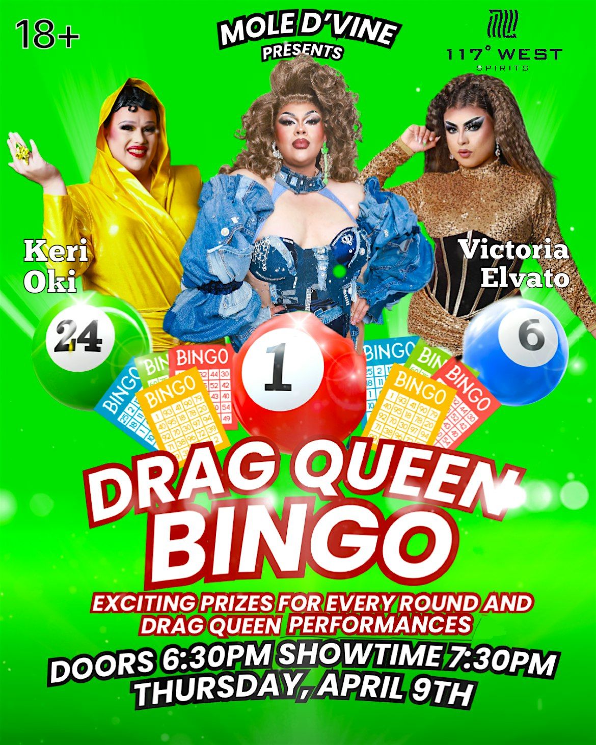 Missed our last SOLD OUT Bingo Show? Well, Join us Thursday, April 9th for Drag Queen Bingo Hosted by Mole D'Vine! With a new cast, the Singing sensation Keri Oki and the Incredible Victoria Elvato. Enjoy a few rounds of bingo, amazing prizes and signiture cocktails from 117 West Spirits.