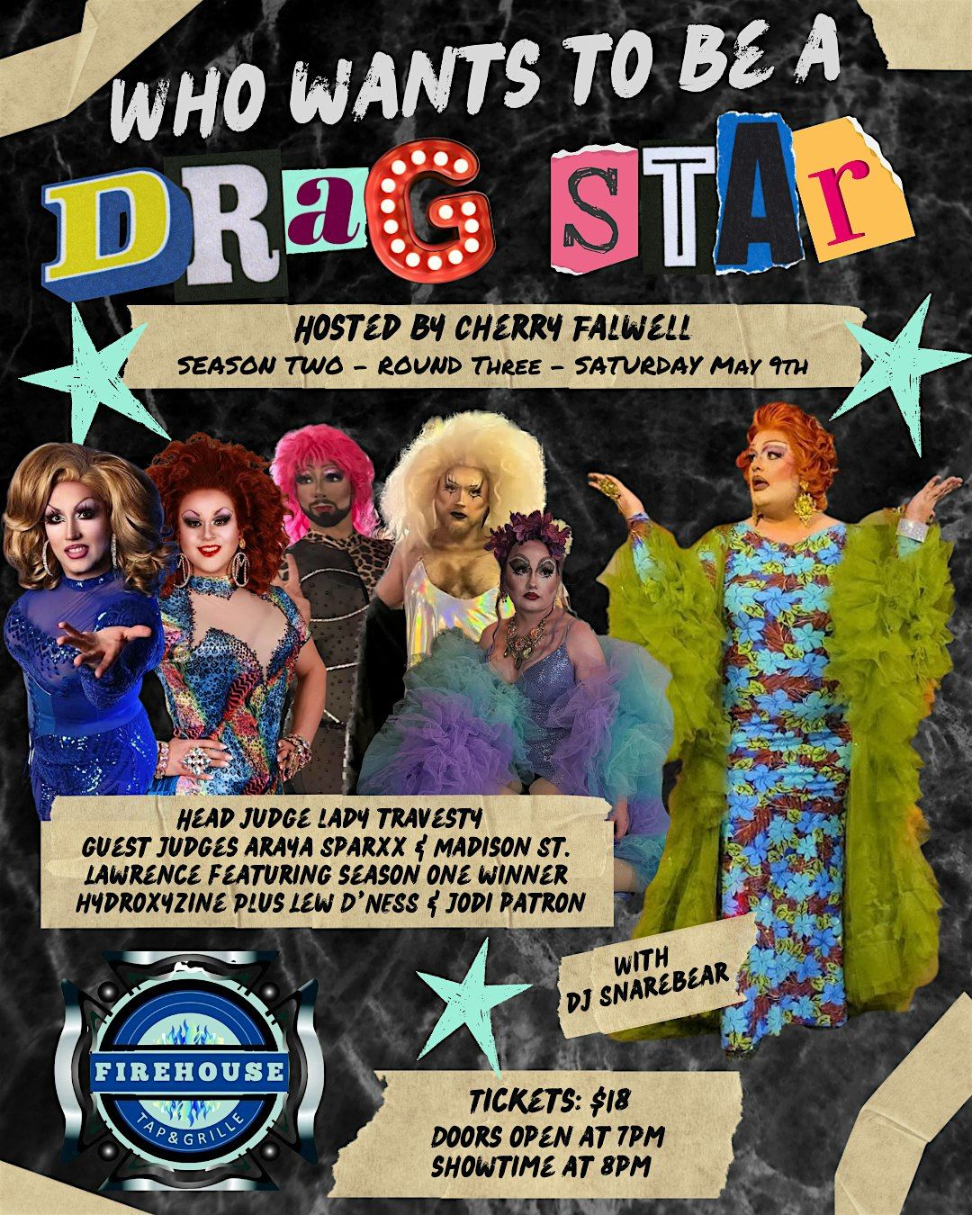 This is the final round of season two before the finale! Join us at our new home, Firehouse Tap & Grille in Meadville, for a night of glitter, laughter, delicious food and drinks, and local drag talent. Featuring hostess Cherry Falwell, head judge Lady Travesty, DJ Snarebear, and guest judges Araya Sparxx, Madison St. Lawrence, and more!