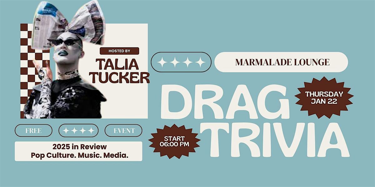 Join us at Marmalade Lounge for a fabulous night of Drag Trivia, hosted by the incomparable Talia Tucker, as we look back on 2025 in Review. From pop culture moments to music hits and media madness, expect laughs, shade, and plenty of surprises along the way.
