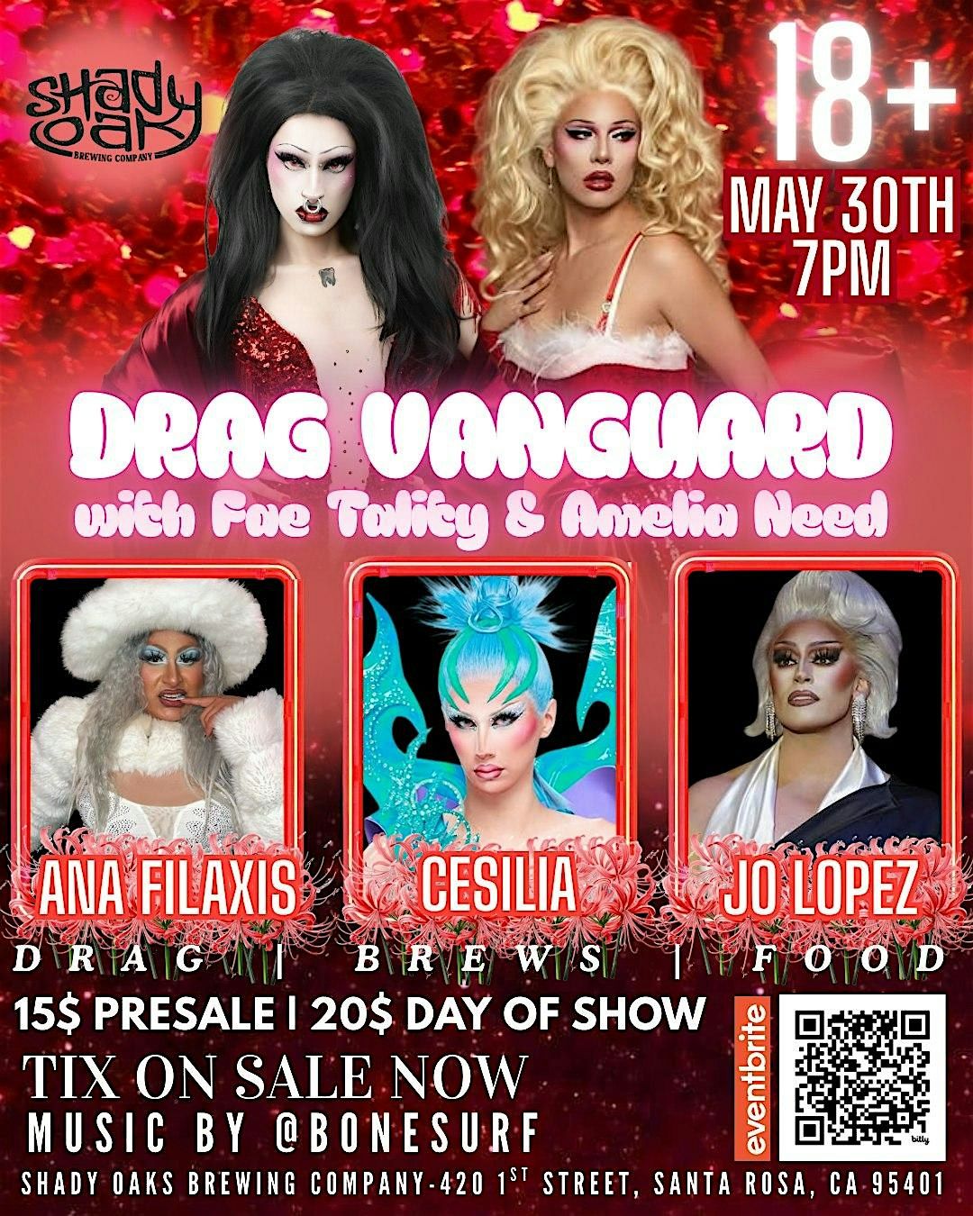 Drag Vanguard is a monthly drag show at Shady Oaks Brewing Company in Santa Rosa, CA. Hosted by Fae Tality & Amelia Need Moore. Each month we bring you jaw-dropping drag, fresh brews, and delicious eats!