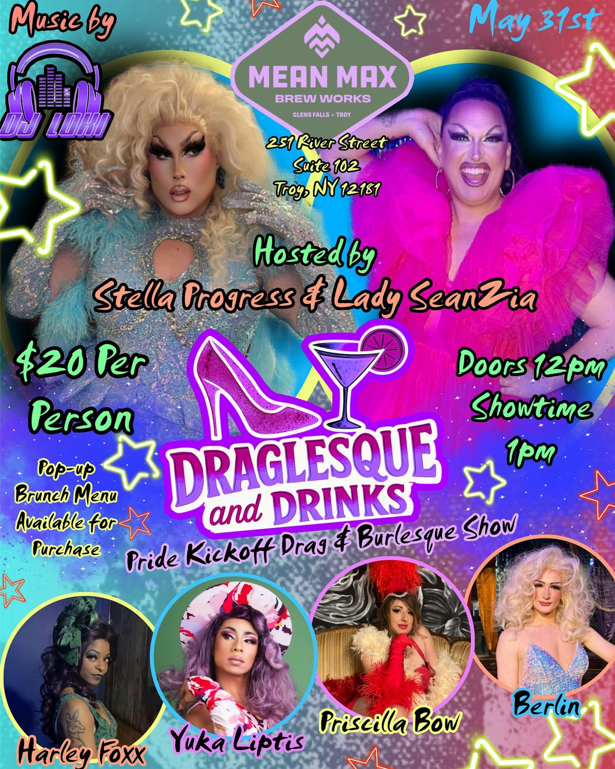 Join us for DRAGLESQUE & DRINK: Pride Kickoff Burlesque & Drag Show ! This spectacular event at Mean Max Brew Work will leave you wanting more! Get ready for a fabulous mix of drag and burlesque and enjoy amazing beverages in style. Stella Progress and Lady SeanZia host a fabulous cast including, Syracuse diva, Yuka Liptis, local burlesque staple, Harley Foxx, local new bombshell, Berlin and Oneonta burlesque baddie, Priscilla Bell. Come ready to enjoy a day filled with amazing performances and fabulous beverages. DJ Loki will be on the beats! Don't miss out on this exciting event – it's going to be a wild time!