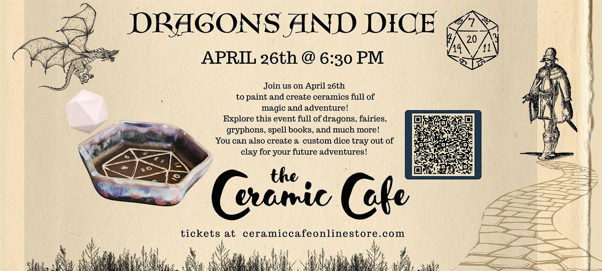 Join us on Sunday, April 26th @ 6:30pm for a ceramics filled adventure! Enjoy fun snacks and the chance to win prizes while you create. Paint from our selection of dragons, fairies, spell books, monsters, and more! You’ll also have the chance to create your own custom dice tray for only $20 at this event! The cost of your dice tray includes returning to paint after its first firing!
