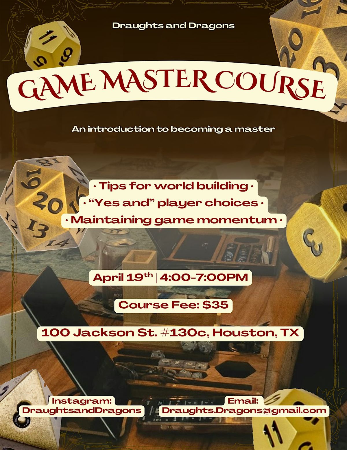 If you have ever wanted to become a game/dungeon master or wanted to join us here at Draughts and Dragons as a potential game master I highly encourage you to come take this class.