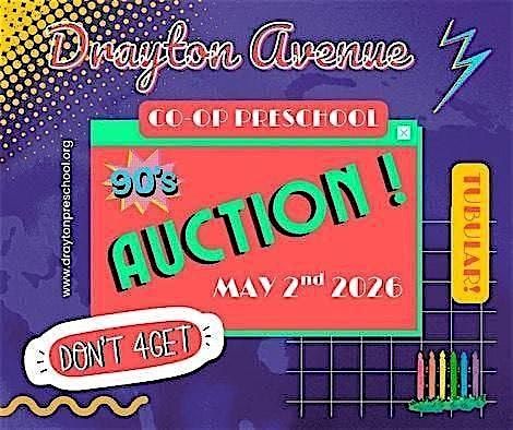 Drayton Ave Co-Op Preschool totally invites you to their annual silent auction. Join us as we take it back to the 1990's for a nostalgic night of bidding, old-school music, and 90's vibes. This year's Annual Benefit Auction will be an in-person event. Tickets are $30 in advance, or $35 at the door, and include light food, beer and wine. Your freshest 1990's threads and kicks are encouraged, but not required. Purchase your tickets today, and join us in supporting our beloved little preschool!