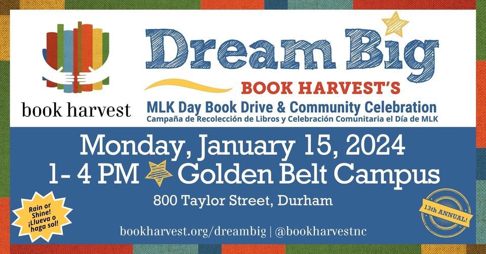Book Harvest will host its 13th Annual Dream Big Book Drive and Community Celebration on the afternoon of Martin Luther King Jr. Day, Monday, Jan. 15, 2024, from 1 PM to 4 PM at the Golden Belt Campus in Durham.Dream Big is an exciting community celebration filled with entertainment, crafts and activities, appearances by beloved mascots, information tables, and more! Community members are also invited to bring donations of new and gently used children’s books to the event as part of the Triangle's largest book drive. All donated books will be provided to children in Durham and beyond through Book Harvest’s book access and literacy initiatives.