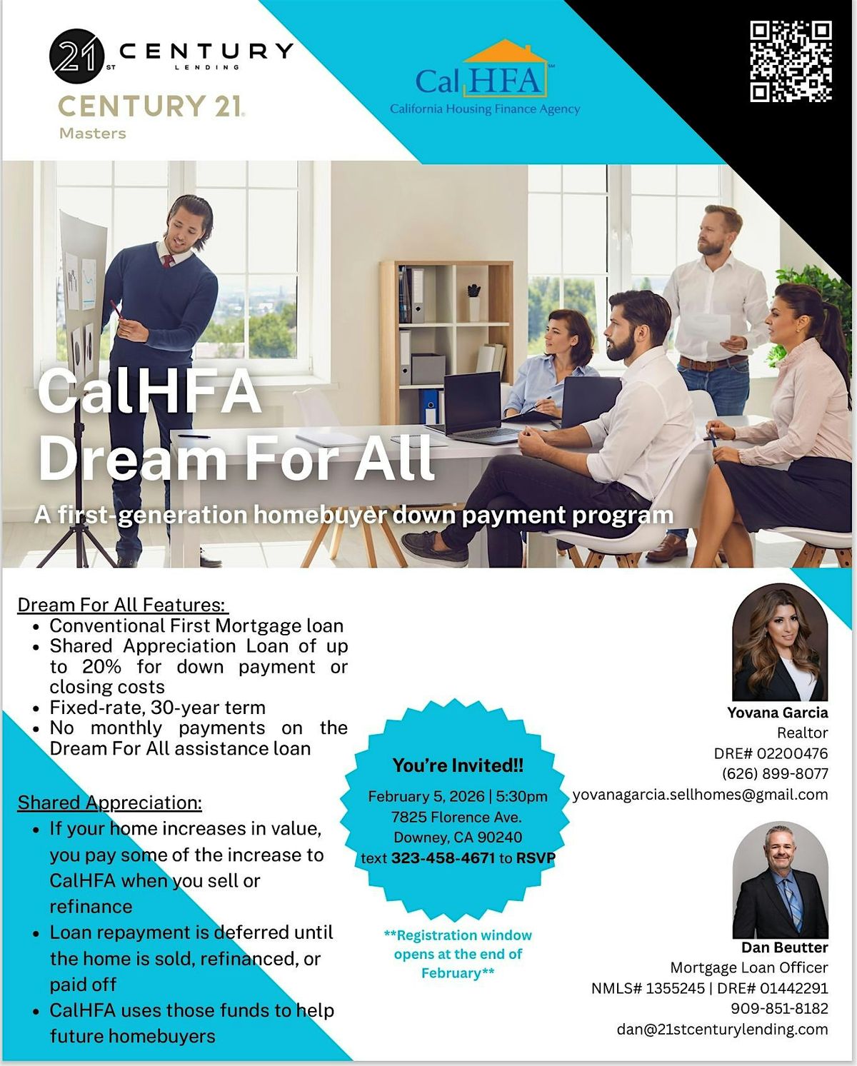 Join us for an informative session on the Dream For All 2026 Appreciation Program, designed to help first-generation homebuyers achieve homeownership with powerful down payment and closing cost assistance.
