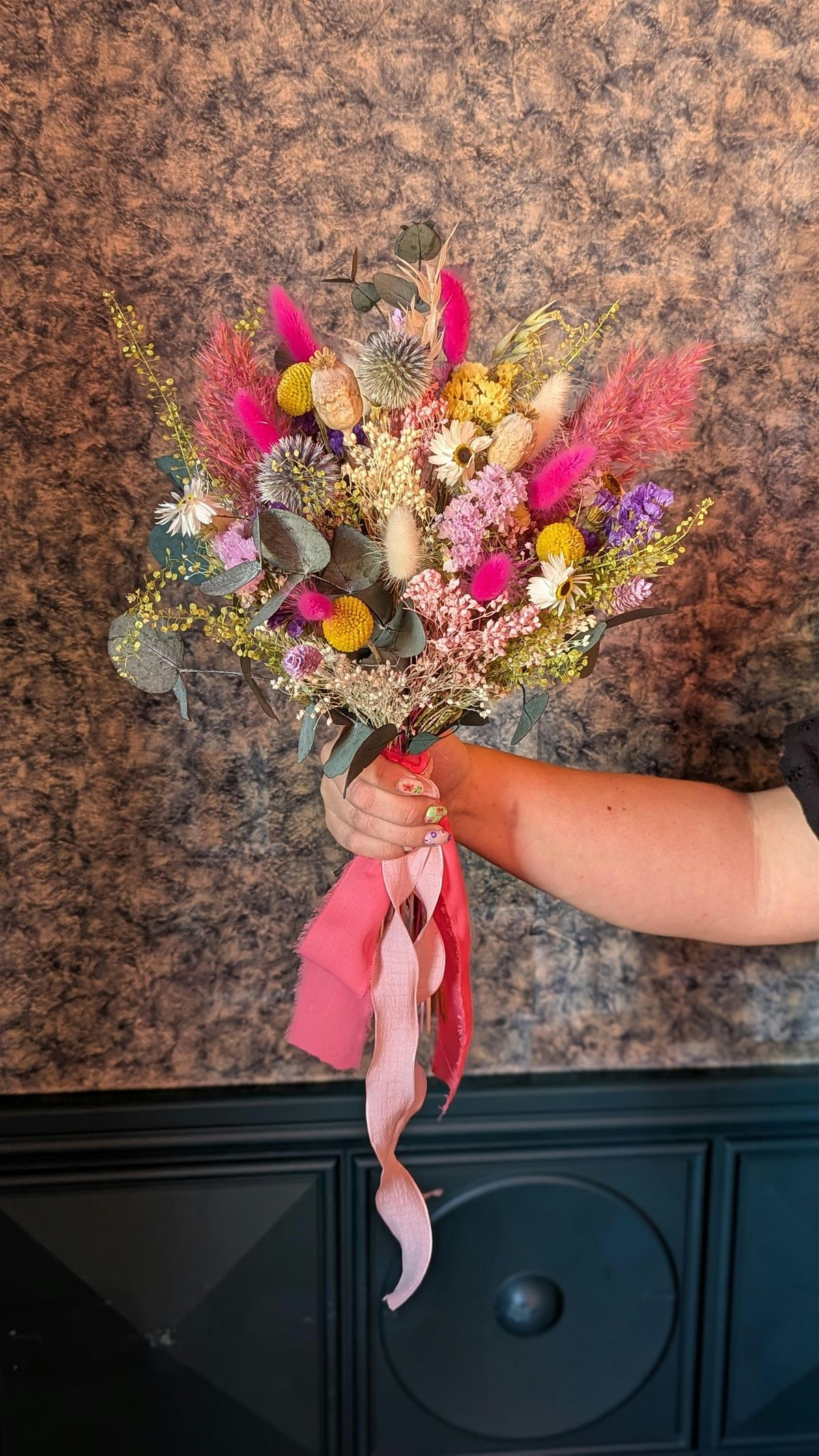 A carefully curated selection of dried flowers, grasses and textured materials will be provided, allowing you to create a bouquet that reflects your own style. No experience needed.