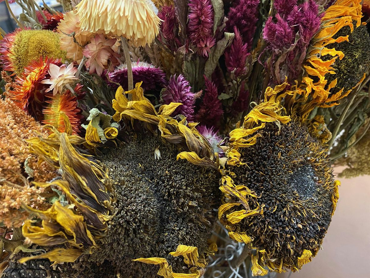 Supplies include a wreath form, heavy duty wire, floral tape, floral wire, and, of course, hot glue. Expect a bevy of dried flower options including a variety of grains, celosia, strawflower, ammobium, statice, and more!