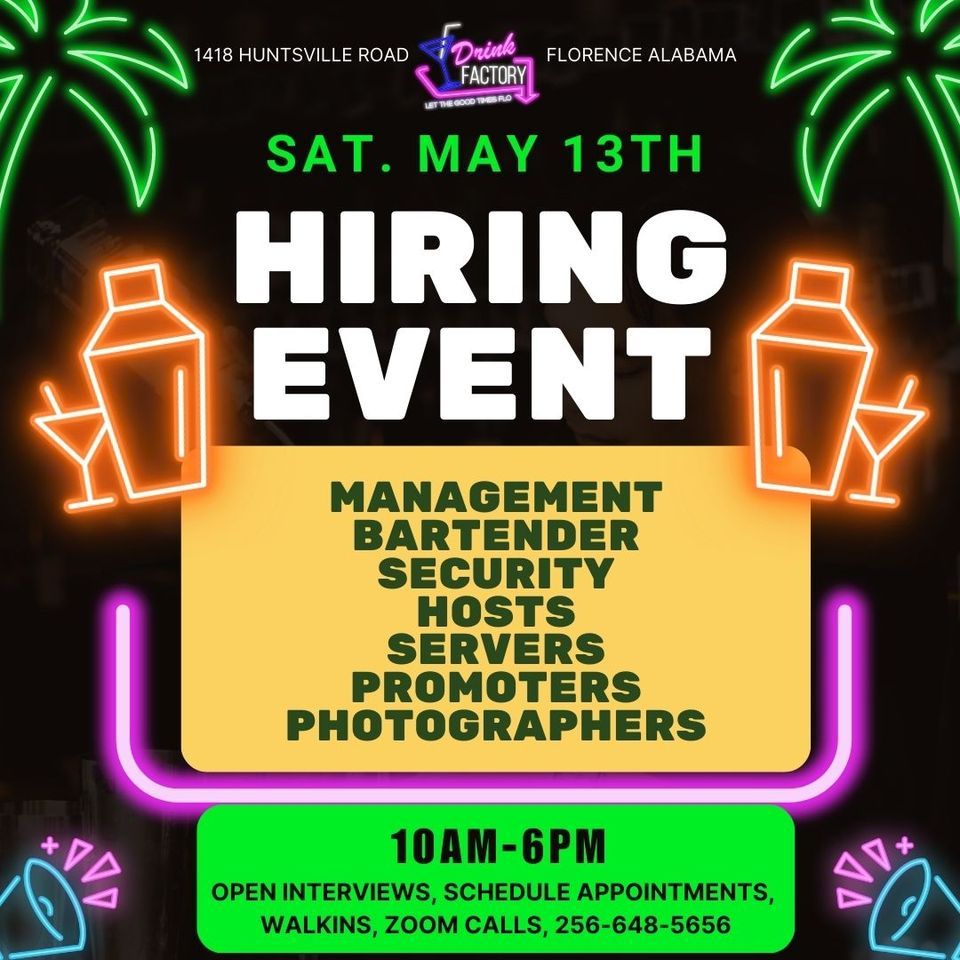 Are you a energetic, creative, disciplined individual with aspirations of putting your talents on display? If so, we invite you to take part in our one day only HIRING EVENT at Drink Factory as we look to expand our business operations around a highly productive group of associates. Below are the details for this event:DATE: Sat. May 13th