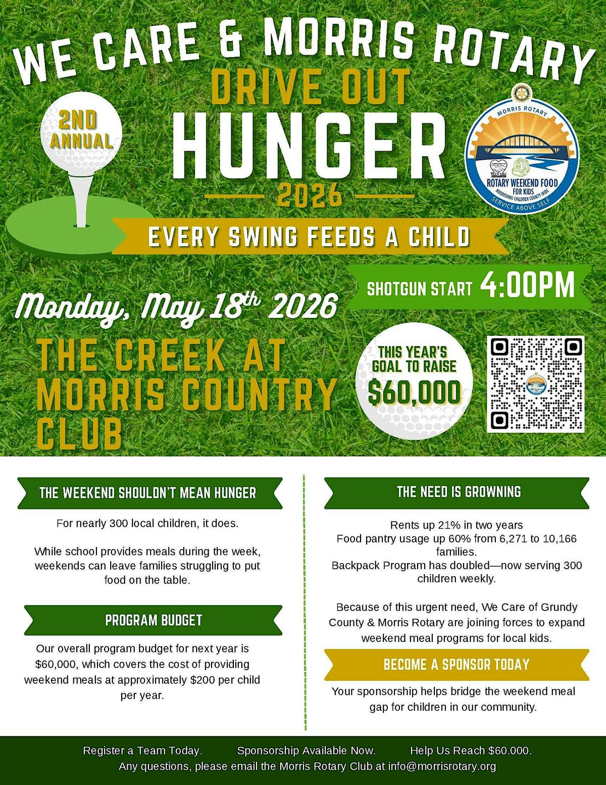 Join Morris Rotary and We Care of Grundy County for a fun-filled day of golf supporting Drive Out Hunger 2026, our collaborative weekend food program serving local children in need.