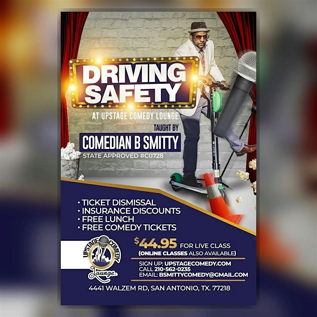 Need ticket dismissal or an insurance discount? Come take your Live Driving Safety (Defensive Driving) Class in person at Upstage Comedy Lounge — taught by Comedian B Smitty.