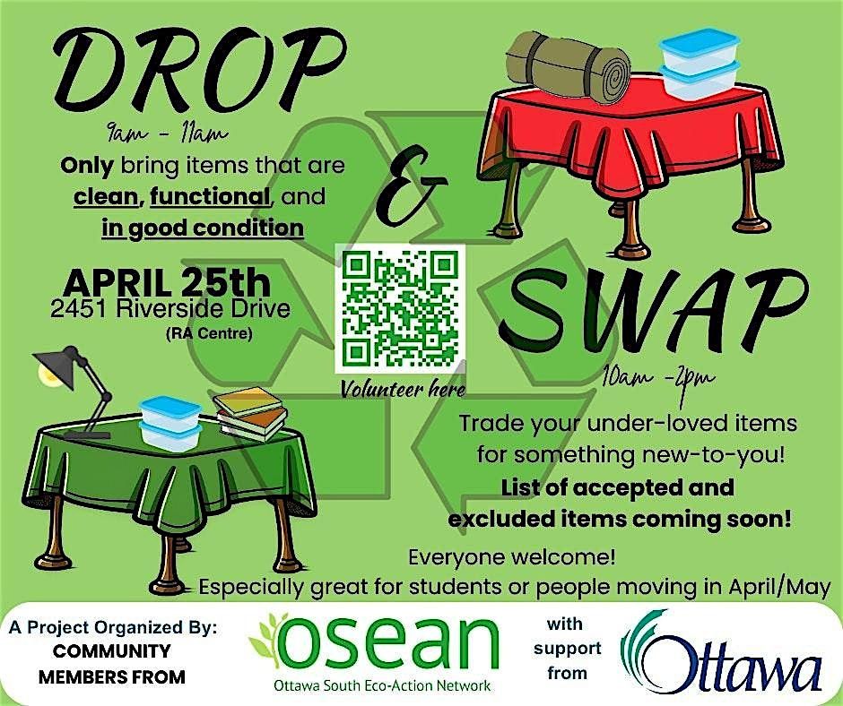 Do you have gently used spring/summer items looking for a new home? Join Ottawa South Eco-Action Network (OSEAN) and Eco West Enders for a free Swap event on April 25th at the RA Centre, Clark Hall!