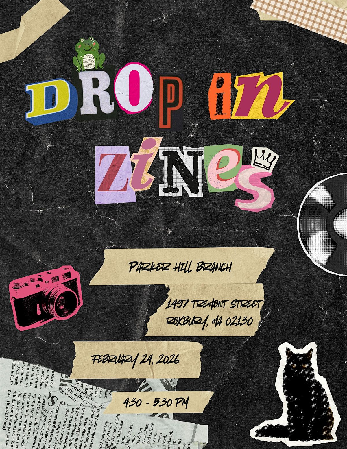 We’ll have all the supplies: scissors, glue, collage materials, old magazines, markers, and plenty of attitude. Make a one-page mini zine or start something bigger.