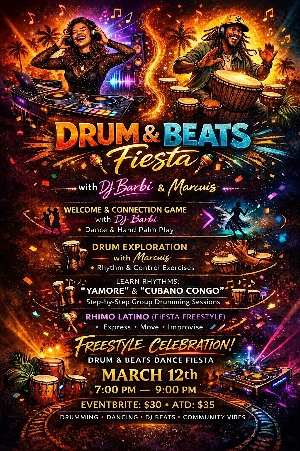 Drum & Beats Fiesta is a high-energy, interactive experience where drumming meets house dance music, guided by DJ Barbie’s magnetic movement flow and Marcuis’ powerful drum leadership. No experience needed. Just bring your hands, your body, and your willingness to play.