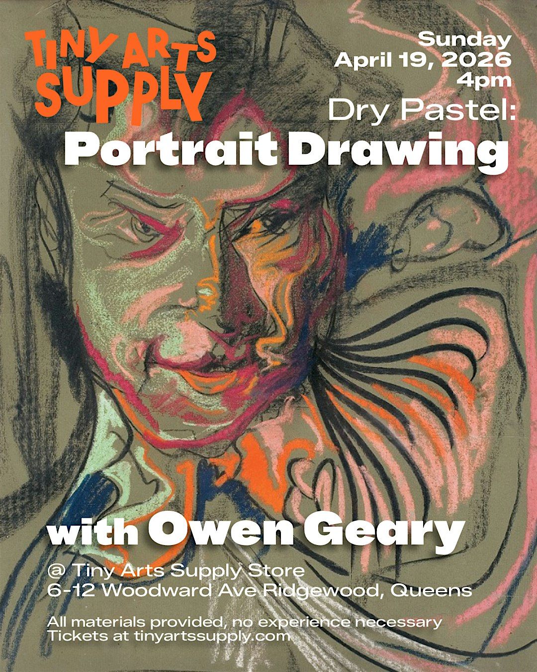 Join Tiny Arts Supply for a hands-on dry (chalk) pastel portrait drawing workshop led by Ridgewood artist Owen Geary. You’ll learn core pastel techniques and create your own portrait on paper.