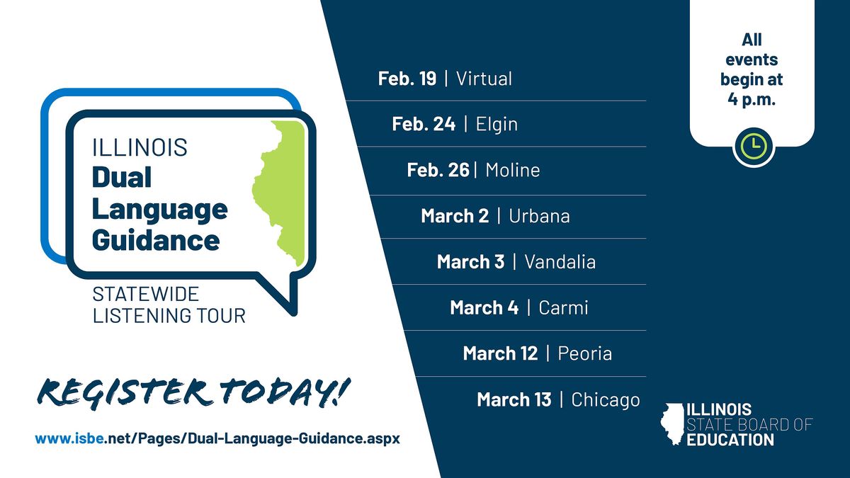 To gather direct input from communities across Illinois, ISBE is hosting a series of in-person and virtual listening sessions. These sessions are an important opportunity to share your insights and help refine the next draft of the Illinois Dual Language Guidance.