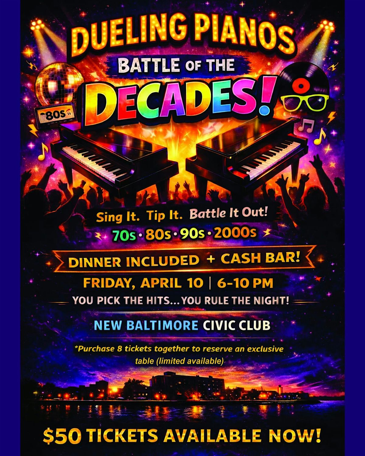 Your $50 ticket includes the dueling piano show, dinner, featuring dishes and sides generously donated by several of our local New Baltimore restaurants, along with a cash bar hosted by the New Baltimore Civic Club, featuring spirits from our hometown Tashmoo Distillery. Purchase 8 tickets together to reserve an exclusive table (limited quantity).