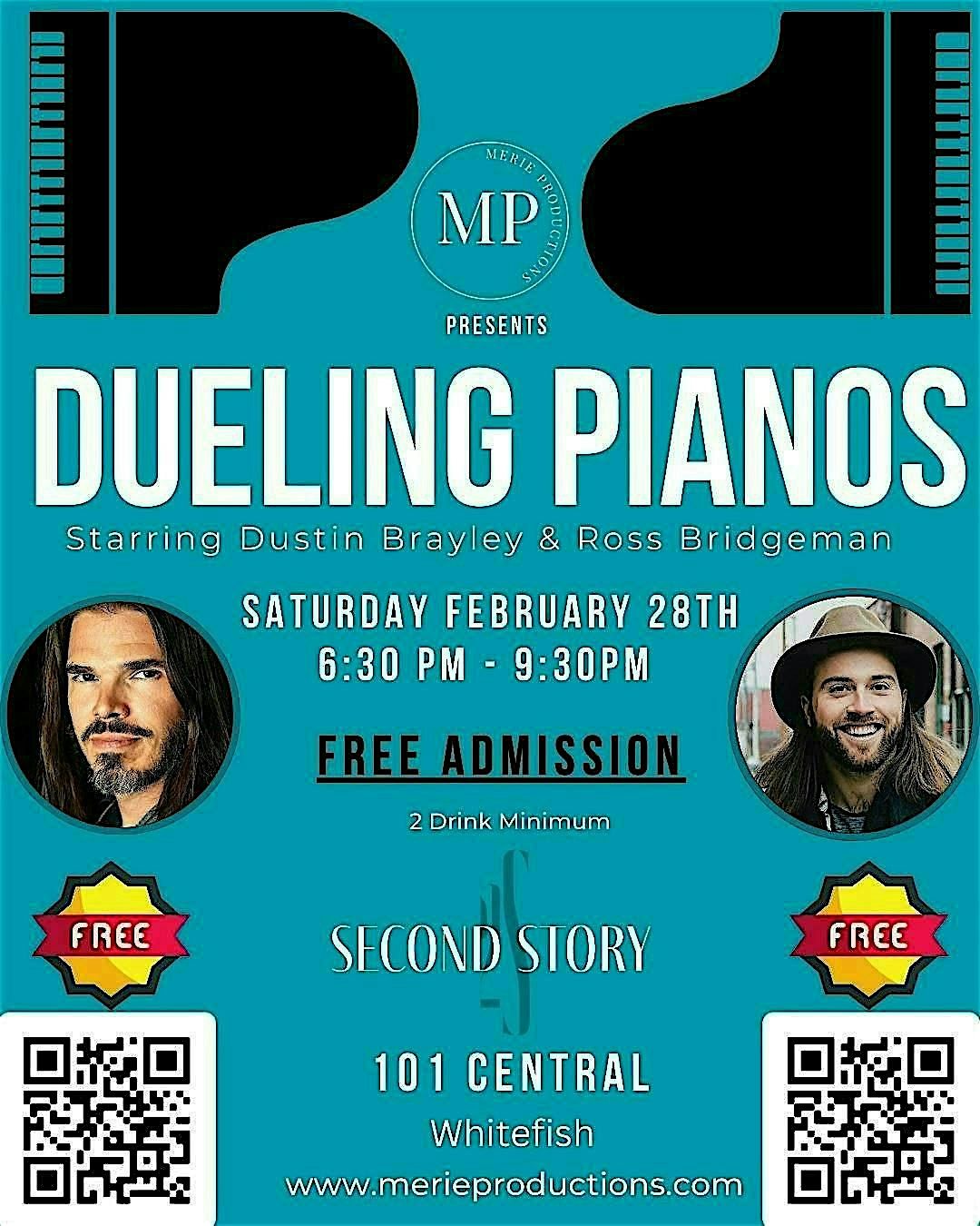 Dueling Pianos at 101 Central’s Second Story is a high-octane, request-driven live music party starring Dustin Brayleyand Ross Bridgeman—two powerhouse performers battling (and blending) their way through the greatest hits of every era. Think part concert, part comedy, and 100% crowd-fueled from the first note to the last.